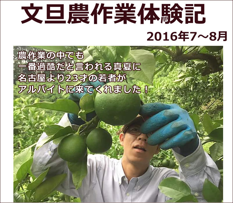 | 僕の農作業アルバイト体験記 愛知県名古屋市 田仲玄樹 大学生の4年間、白木果樹園では土佐文旦の繁忙期の間だけアルバイトをさせてもらっていました。 バイト内容は、お客様からの注文を伝票に打ち出す作業、その伝票を梱包した商品に貼る作業、文旦を入れる段ボール箱の組み立て、文旦の箱詰めと様々なものでした。 事務の仕事は暖房の効いた温かい部屋でいかに集中して、素早く正確に数をこなしていくか、というのがテーマでした。 パソコンをいじることが好きなので、この仕事は好きでした。 作業場での仕事は寒い冬ですが体を使うのでそれほど寒くなく、運動が好きな私にとっては積みあがった段ボールを見て「こんなにやったか!」と達成感を味わうことができて、これも好きな仕事でした。 今までやってきた仕事は何をすればいいのかが明確で、本気を出して頭を働かせて効率を追い求めれば作業スピードが上がっていくことが実感できたので、好きだったのだと思います。 しかし、今年の夏のバイトは違いました!!! 事務所ではなく、実際に果物たちと向き合う作業です。 決定的に違うのが、気温です。 |